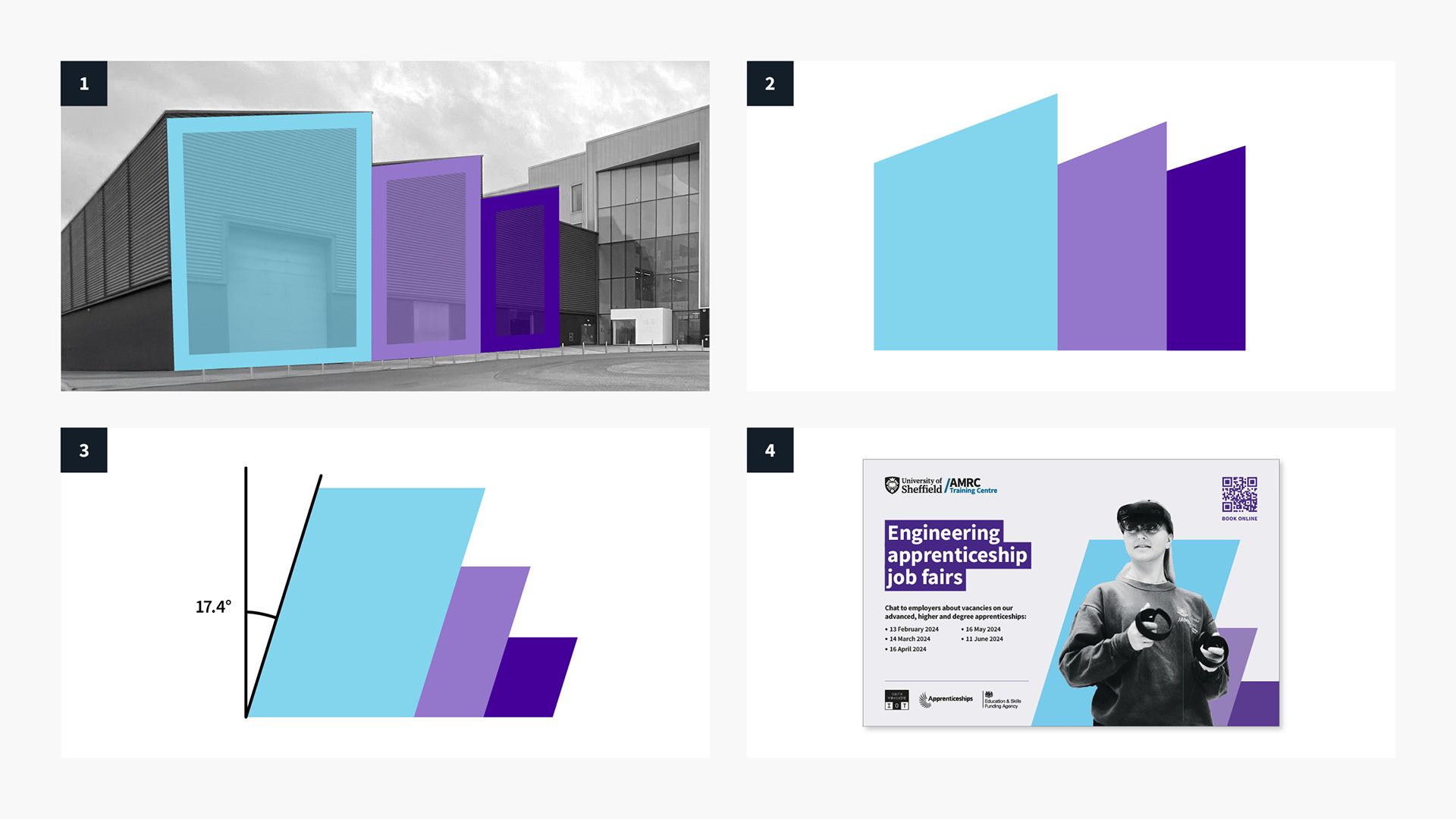 The slash – a key element of the AMRC visual brand – was repurposed to a repeating motif that nodded to the shape of the Training Centre building.